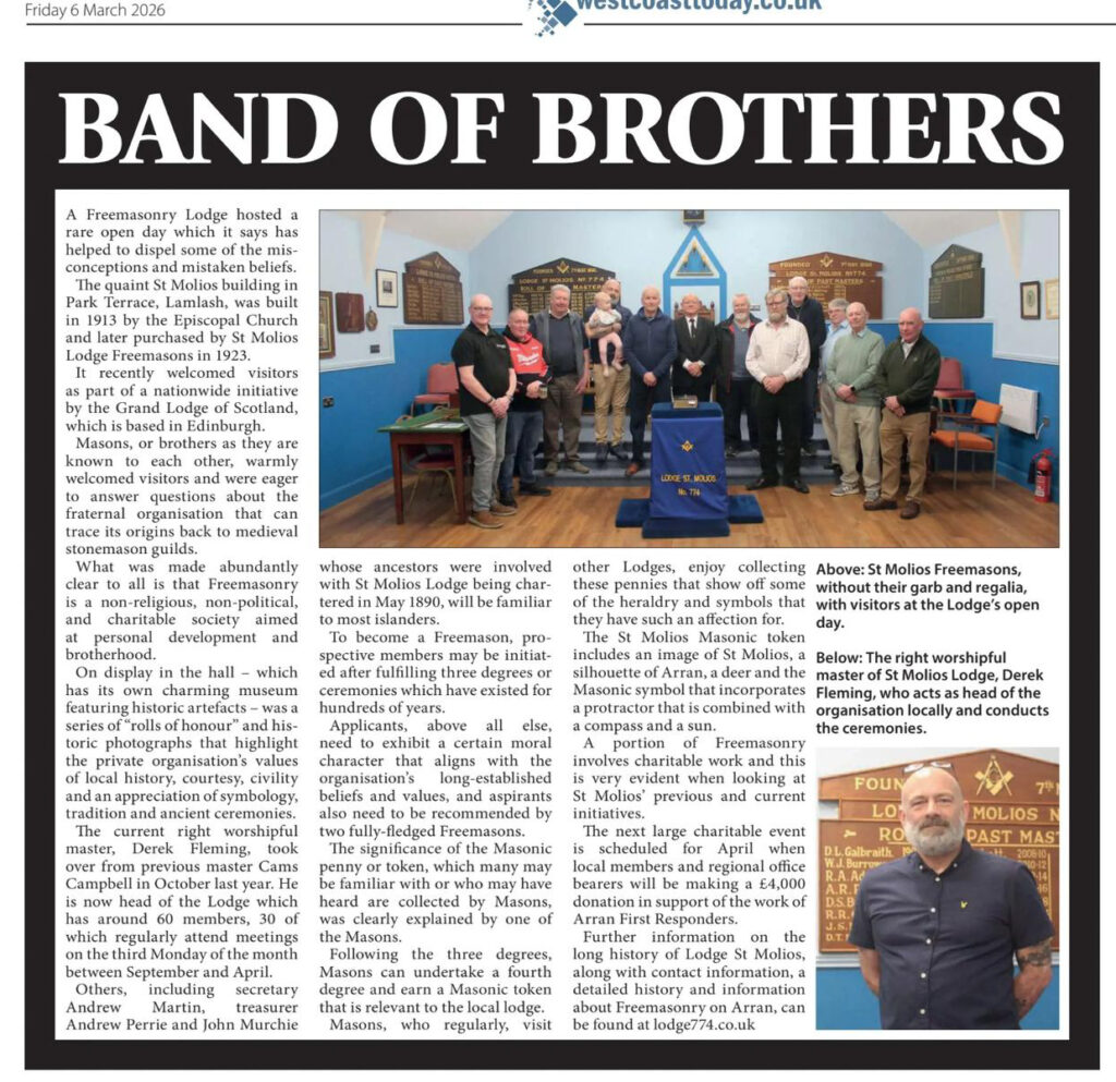 Lodge St Molios No 774 on Arran held an open day on Saturday, 28 February as part of the Grand Lodge of Scotland’s initiative. It was a fantastic day and we were pleased to get this article in the Arran Banner issue of 6 March 2026.